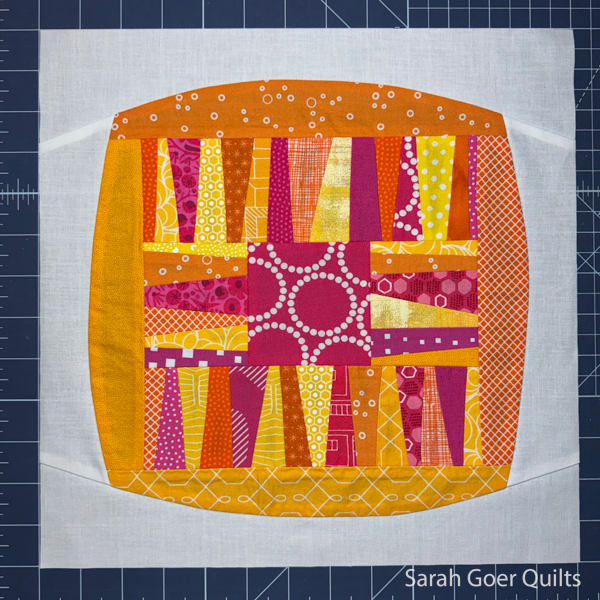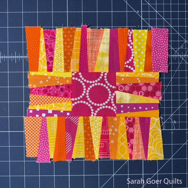 For the second block I took inspiration from my round robin unit. I created a large wonky strip set wide enough to be trimmed on the diagonal to be the center section of my second block.