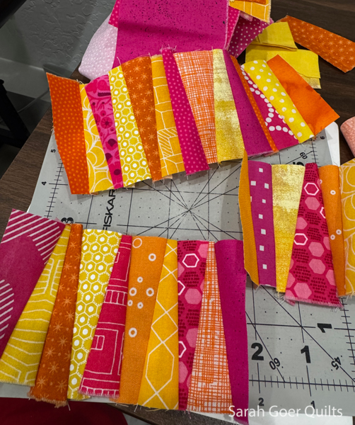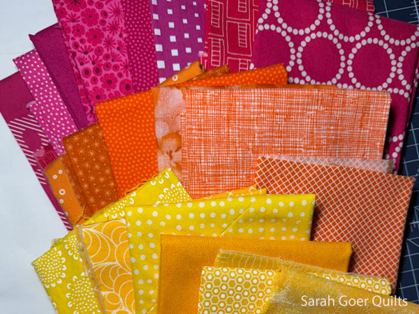 Then I started piecing boxy sections of magentas and corals to be a center section. Since I wanted to use different color combinations in the different background sections, I pieced yellow and cream for one corner.