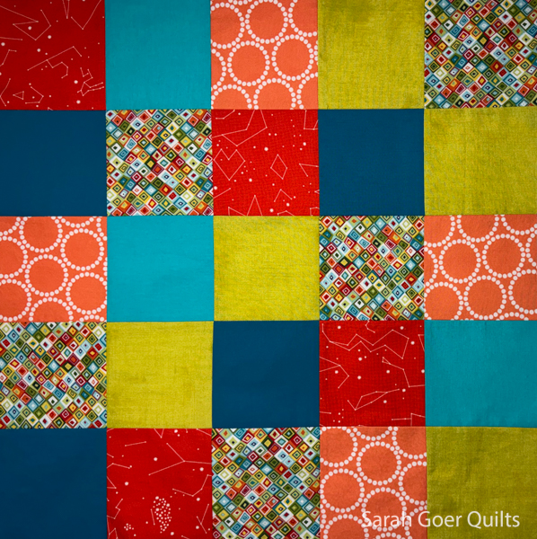 Month 1: make a 5x5 grid of 4.5" x 4.5" squares. I opted for just a few of my main print and filled in with some of my solids and blenders. Unlike some folks, I chose for a random layout with respect to fabric placement.