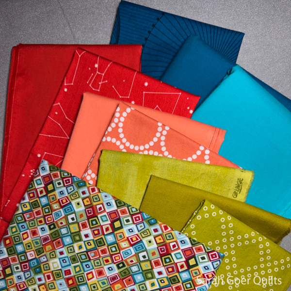 Anything goes for fabric selection. Some folks chose solids, some chose prints. I selected a mix. The palette was based on my main print with solids and blender fabrics that coordinated. My solids are Kona Pimento, Oasis, Breakers, and Pickle, and Michael Miller Peach.