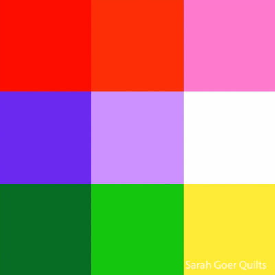 Elizabeth provided this graphic with color recommendations (Red, Red-Orange, Pink, Violet, Lavender, White, Dark Green, Green, Yellow) and asked for 9 1/2" plus sign blocks that feel graphic and improvisational.
