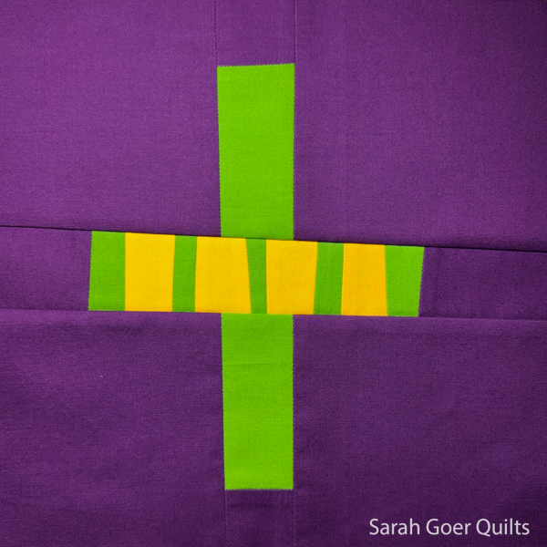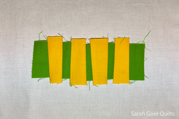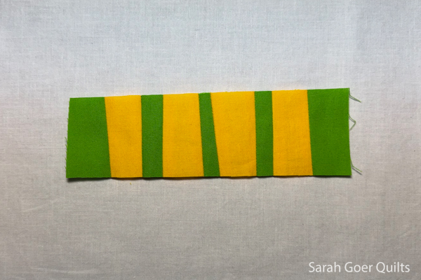 In my first block I created a green and yellow strip set to use for one stroke of my block. Before I trimmed it down, I really liked the shape of the yellow sticking out farther than the green.