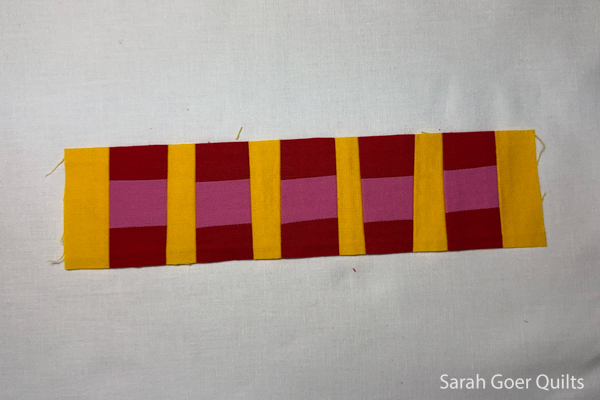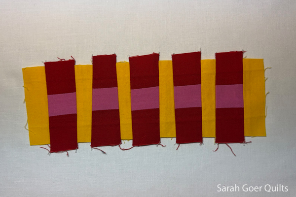 So for the second block I pieced red and pink strips before making this strip sets. Red was my background for this block so this achieved the feature of the yellow pieces being taller than the pink in the finished strip. (It's a different proportion than the strip set for the first block.)