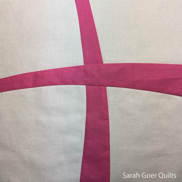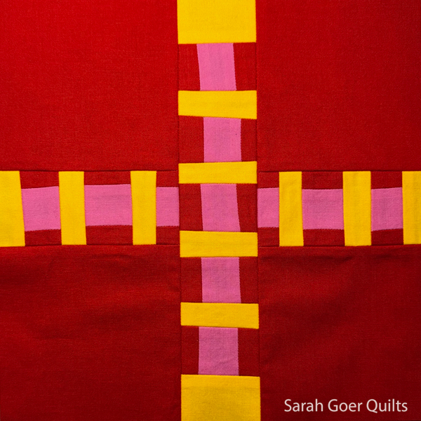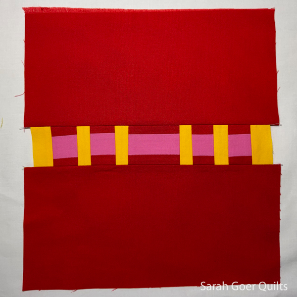 Following the same process I created a second strip set, leaving a larger center section. I pieced this strip into my red background before making a vertical slice to insert my first strip.