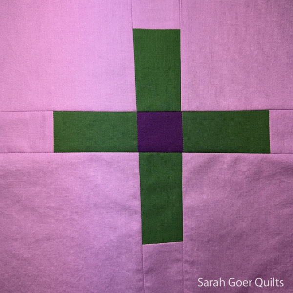 Blocks 3 and 4. In block three, I used a scrap of dark purple leftover from creating block one. And my dark green fabric was a small scrap, so I chose to use that with the dark purple to create the plus. Since these were both darks, I chose a lighter color that I hadn't used yet for the background. The plus is intentionally off center. In block four, I had cut a piece of white fabric as the background for a previous block before changing my mind. So I used that for my background. And my scrap of pink fabric was side enough to cut strips to insert across the entire width of the block. I hadn't used improv curves yet, so I went for a simple two-color block with improv curves.