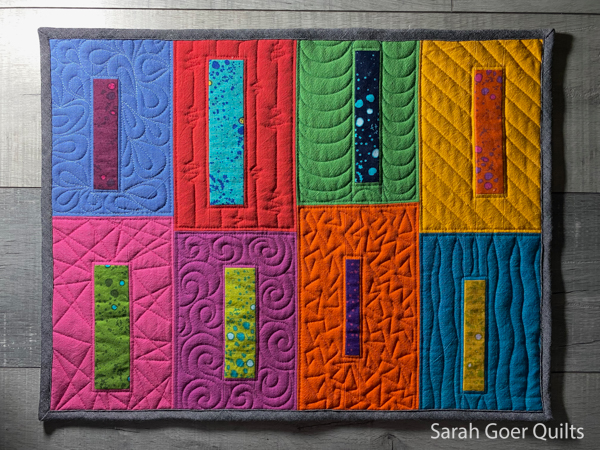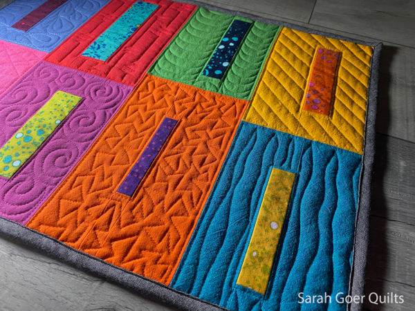 I quilted with walking foot quilting in two colors, Aurifil 50wt Baby Pink (#2423) and Light Lemon (#2110). It's bound in Kona Burgundy and finished at 19" x 21".